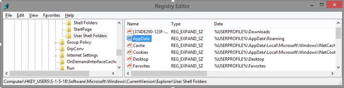Change AppData value to %USERPROFILE%\AppData\Roaming