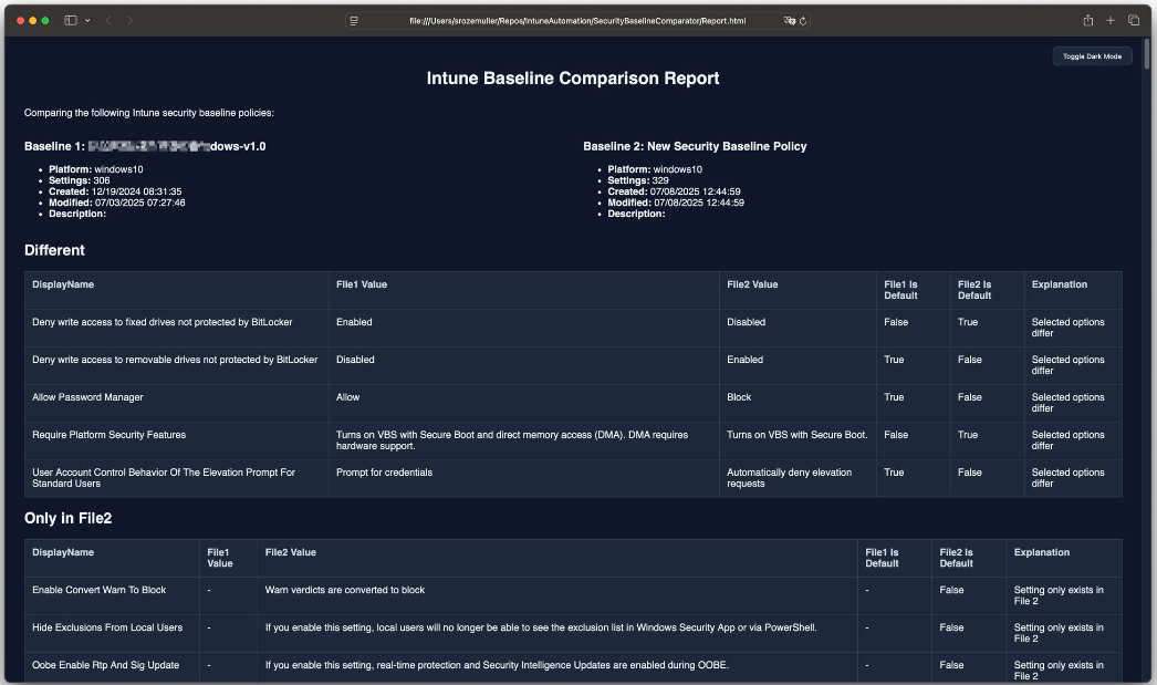To address this challenge, this PowerShell script automates the comparison of Intune security baselines and generates a detailed HTML report.