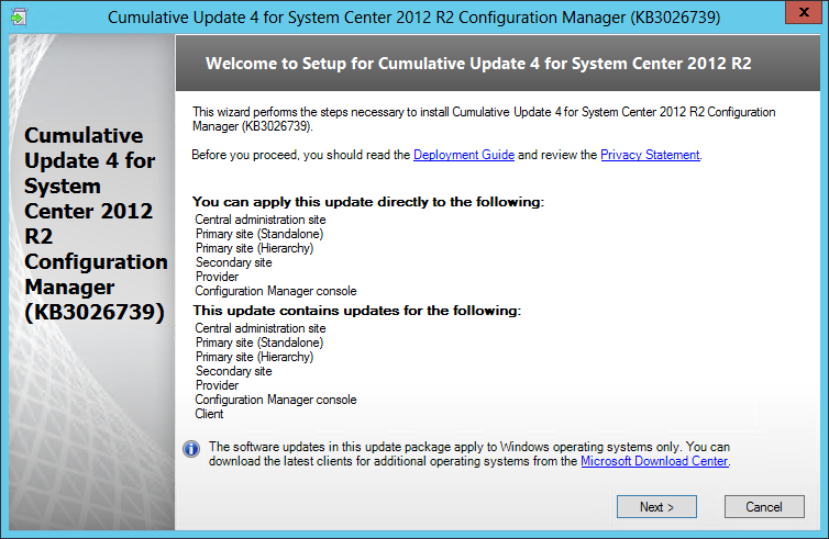 To start the installation, rdp to your Primary Site Server, and run CM12-R2CU4-KB3026739-X64-ENU.exe